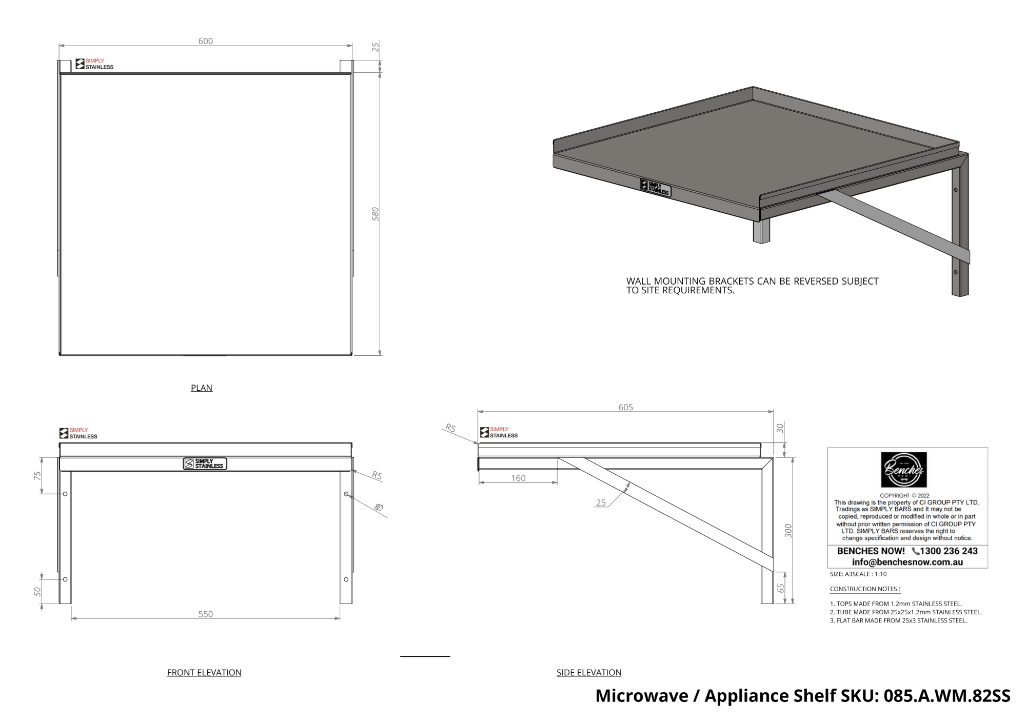 - 25mm x 25mm stainless steel tube with 1.2mm stainless steel top