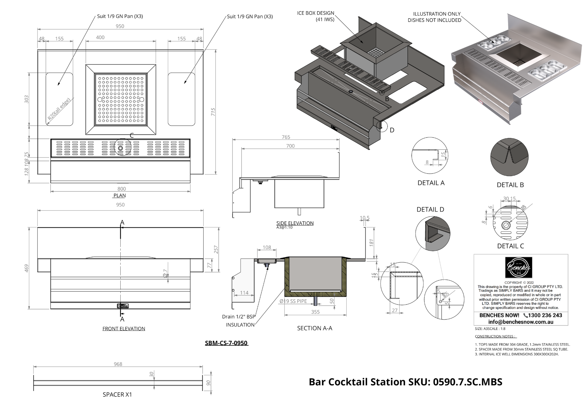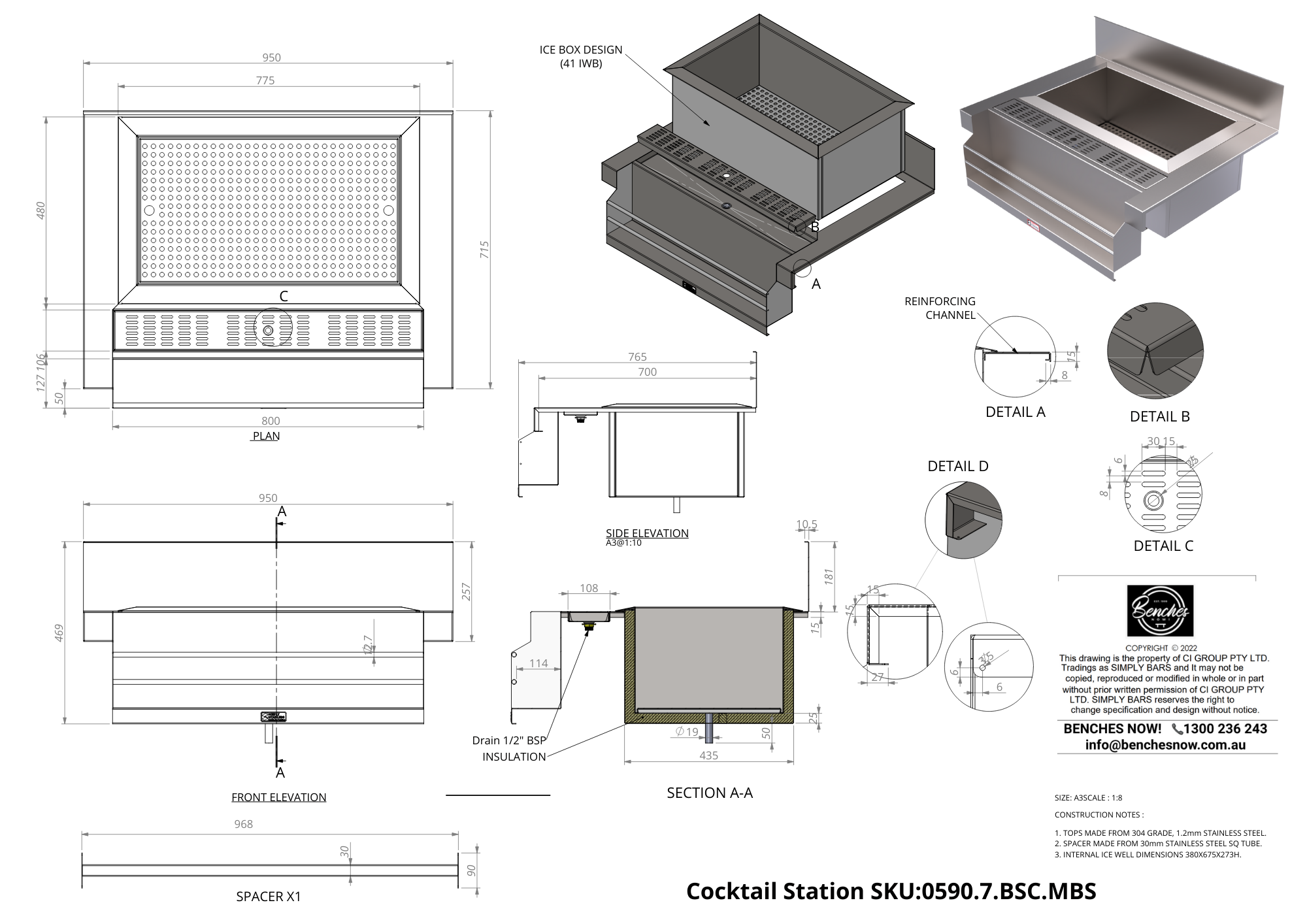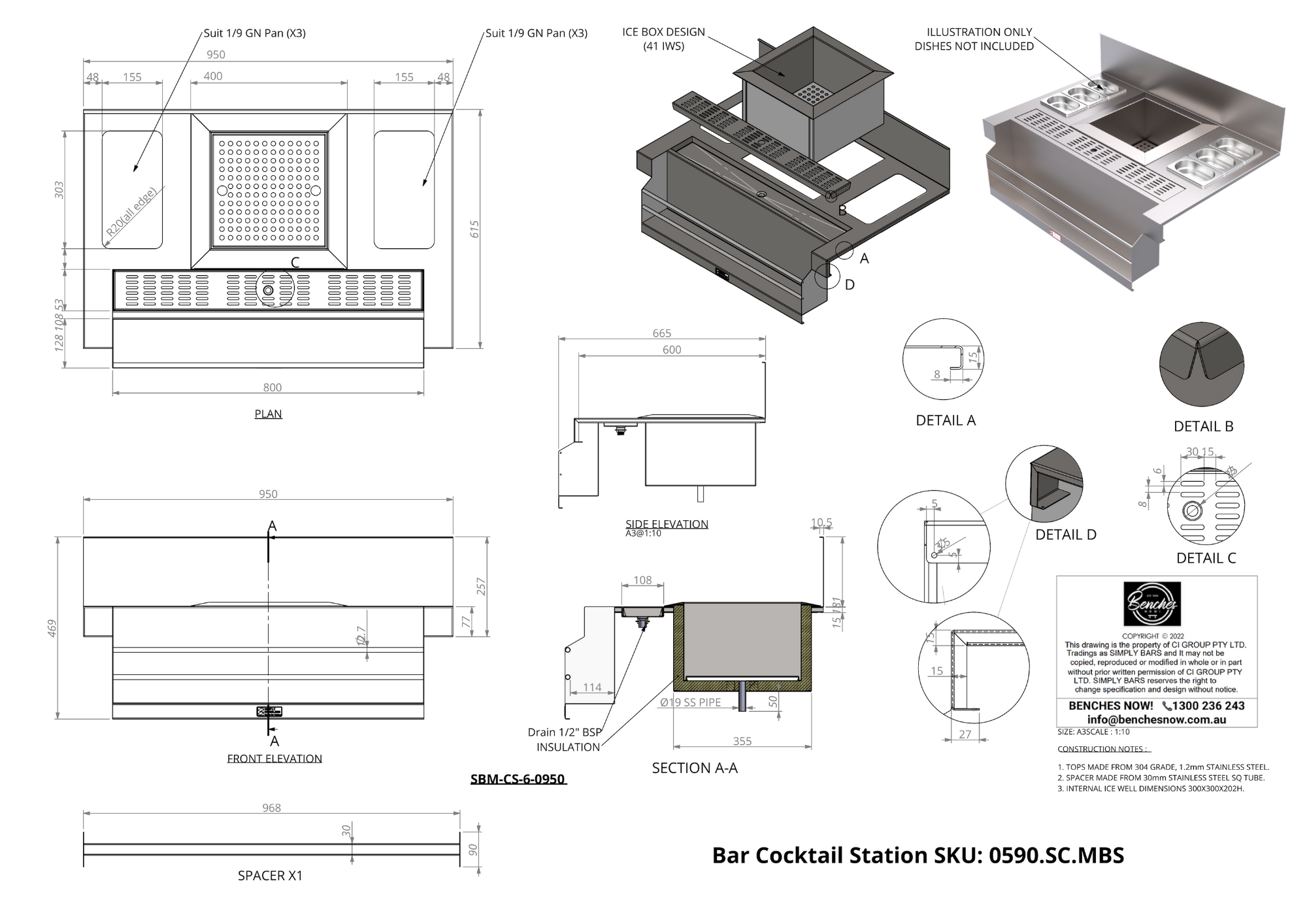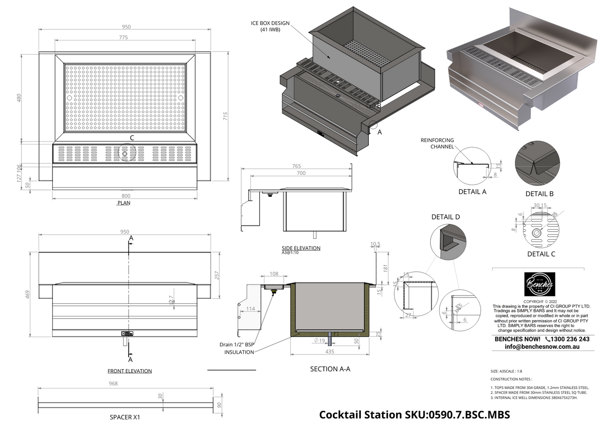 Fully insulated stainless steel ice well, removable drip tray 2 x stainless integrated rods